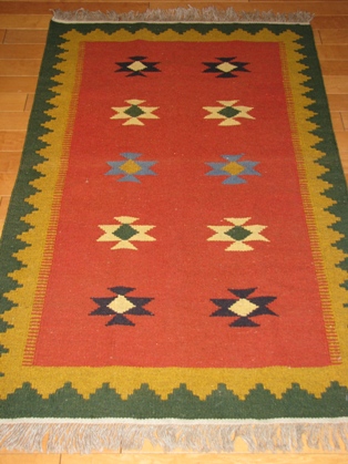 オレンジ、イエロー、グリーンのバランスがとても綺麗な色合いのキリム。星の文様は、幸せや豊穣の意味があります。玄関のほかタペストリーにすると、お部屋が一瞬に明るく変わります★