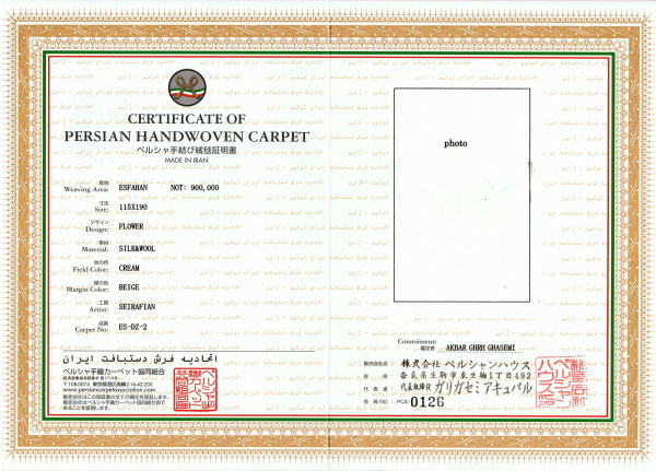 当店では本物のペルシャ絨毯である事を証明する、証明書を絨毯にお付けいたします。 この証明書を発行しているのは、関西ではペルシャンハウスだけです。